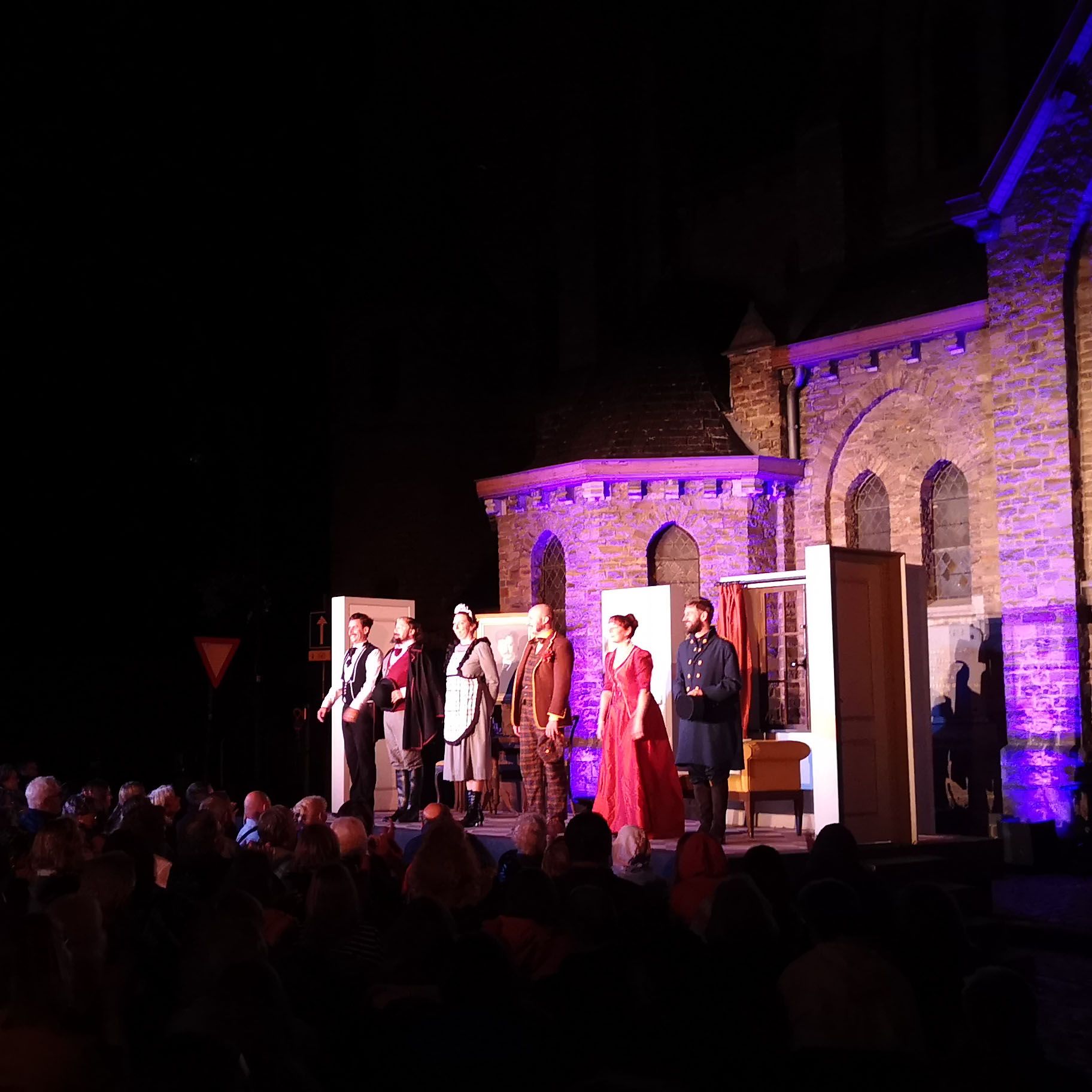 A Ittre également, la météo, d’abord incertaine, a fi ni par se calmer pour une superbe soirée au pied de l’église Saint Remy. Le théâtre ambulant de la Cie des Galeries a posé ses tréteaux pour la première fois sur la Grand-Place d’Ittre, pour le plus grand bonheur des spectateurs qui ont pu profi ter du talent des comédiens et de la beauté de la place. Une soirée dédiée aux Patros d’Ittre et de Virginal qui ont assumé leur tâche de bénéficiaire de la soirée en servant le public au bar et à l’entrée. Une belle implication de notre jeunesse.