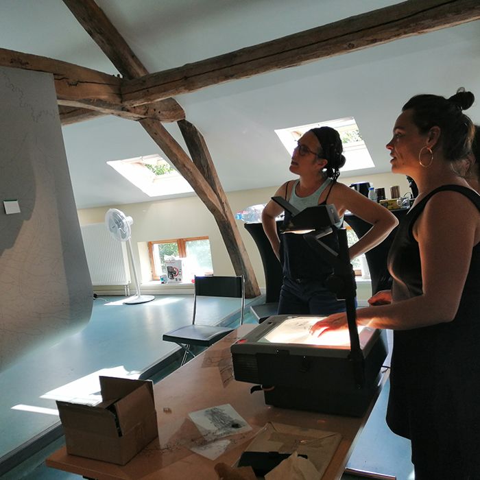 C’est ainsi qu’avec un petit groupe d’une dizaine de personnes, nous avons arpenté, sondé, dessiné, photographié, observé avec tous nos sens, une partie de notre jolie commune, aux alentours de l’écluse et de l’ancien canal. Au terme de cette balade, nous nous sommes revus à deux reprises pour dessiner, puis graver dans une grande plaque de linoleum et enfin imprimer notre «carte» en noir et blanc sur un épais papier.