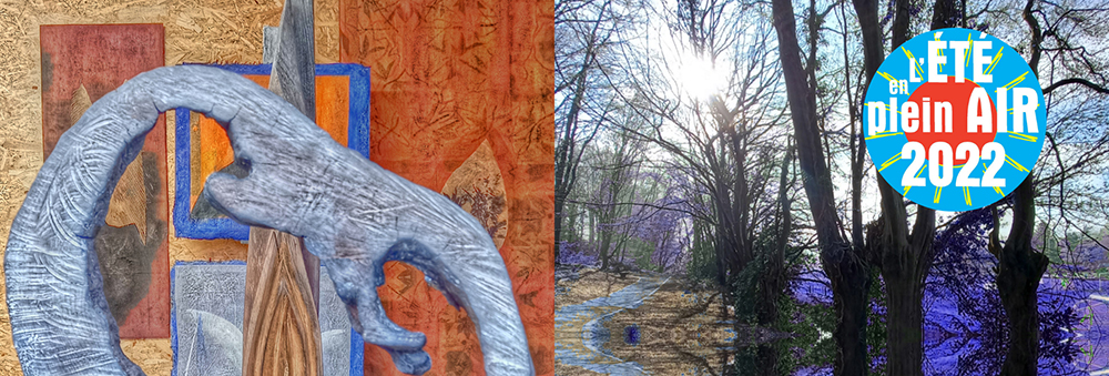 Exposition de photos sur bâches, sculptures en bois, tableaux et gravures