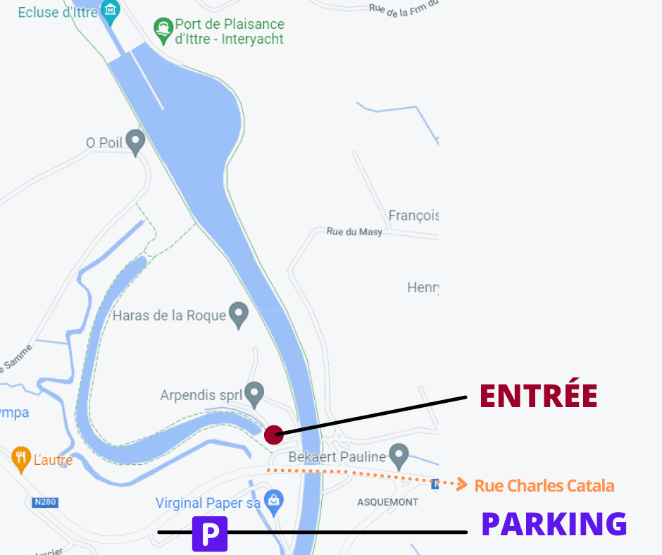 Garez-vous sur le parking des anciennes papeteries de Virginal (Rue d'Asquempont). Quelqu'un sera présent sur place pour vous guider. Après, il suffit de longer le canal, de suivre les flèches et les brûlots et vous arriverez à l'entrée de l'événement.